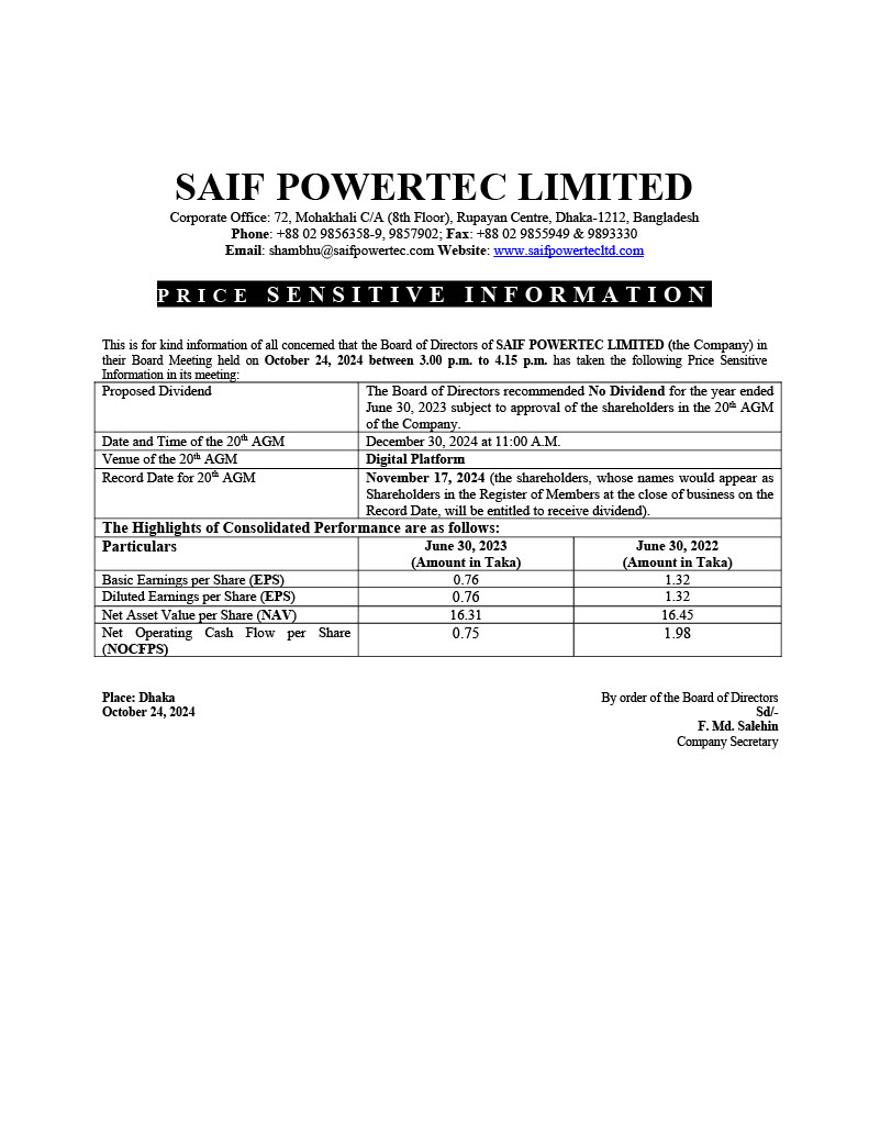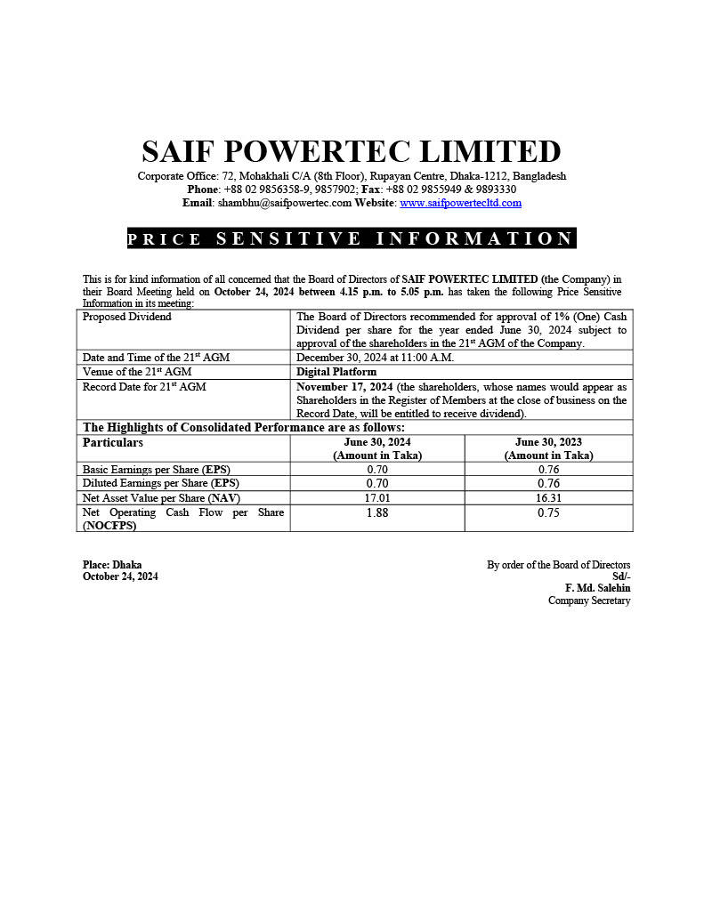SAIF POWERTEC LTD PRICE SENSITIVE INFORMATION